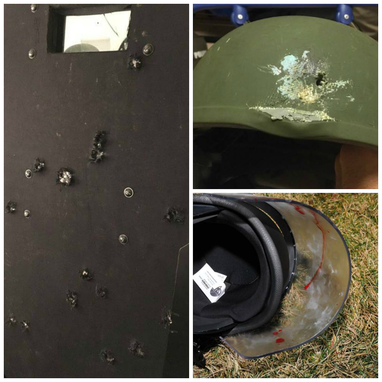 *clockwise- shield used in the Bataclan siege, helmet from Orlando Pulse shootout, and Ferguson riot helmet*