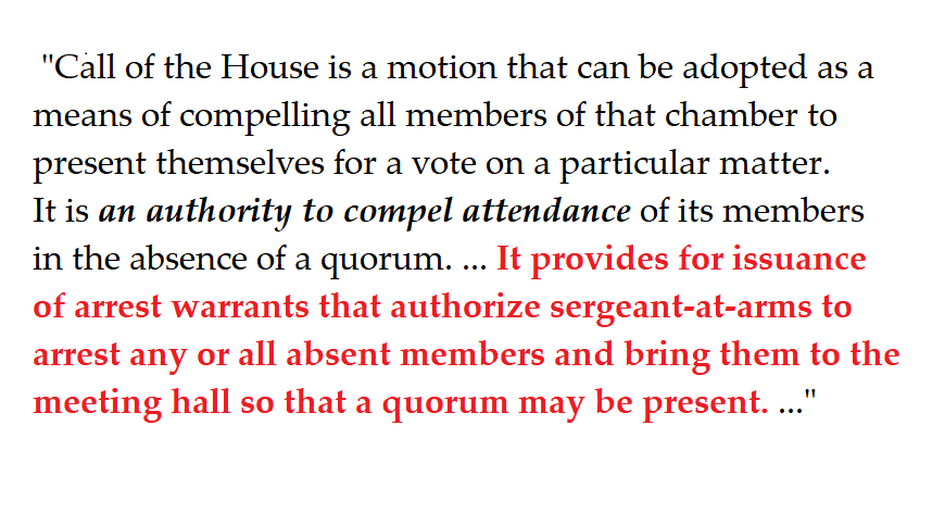 Article 1 Section 5 provides that absent legislators may be compelled to attend; that was included in the Founding Fathers’ framework just to prevent a salty minority from holding a vote hostage by refusing to show up for work.